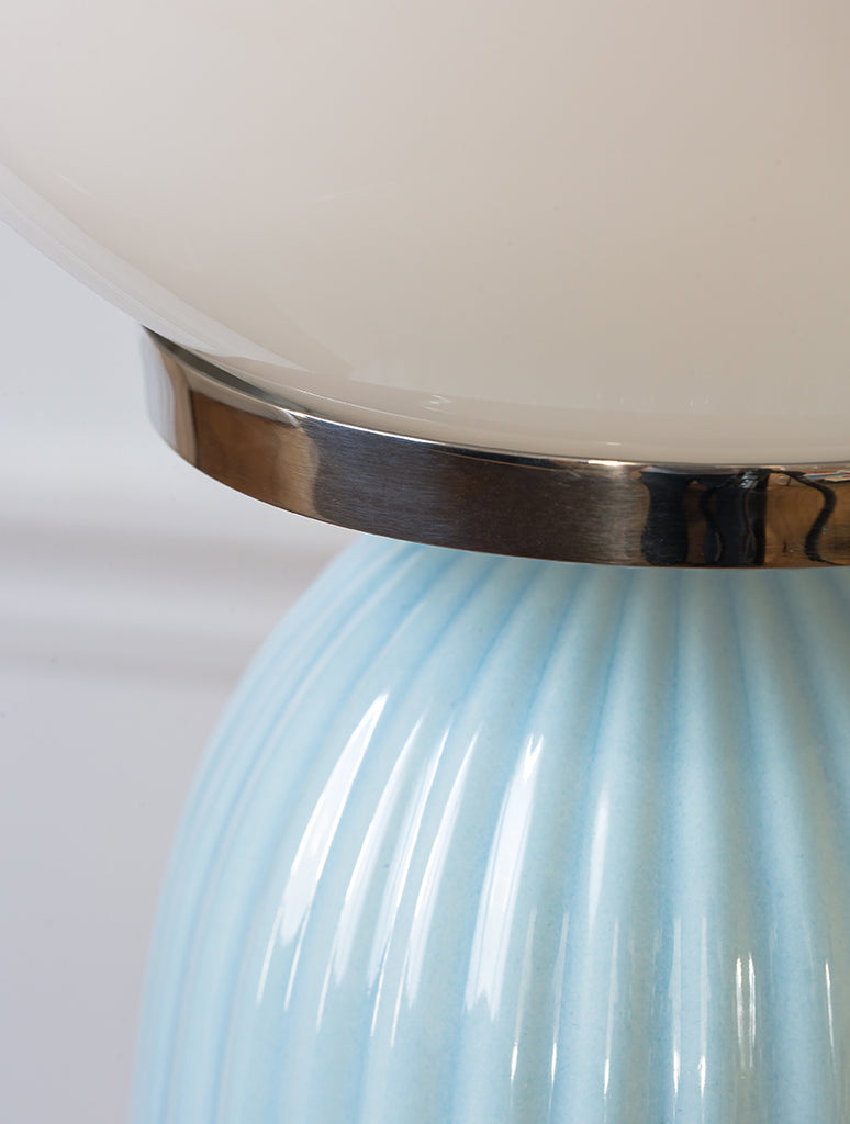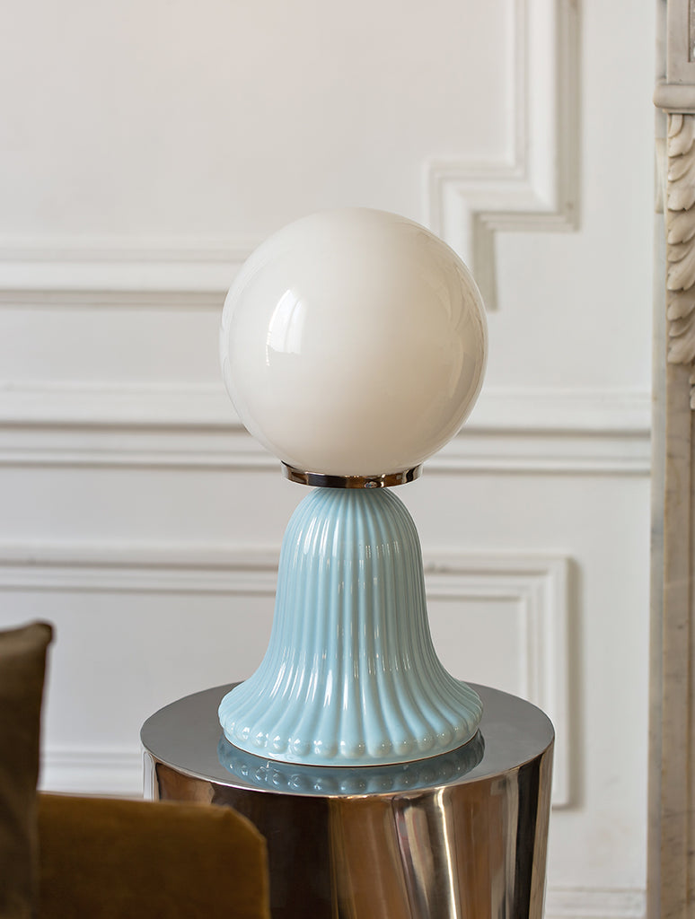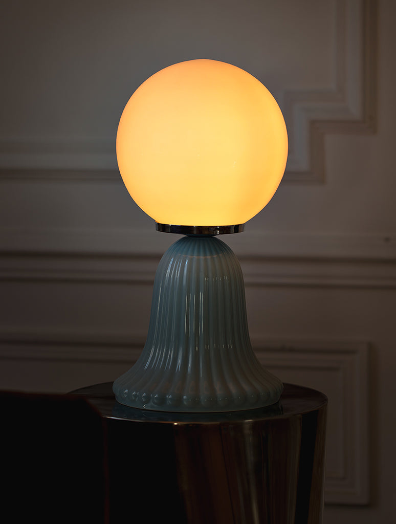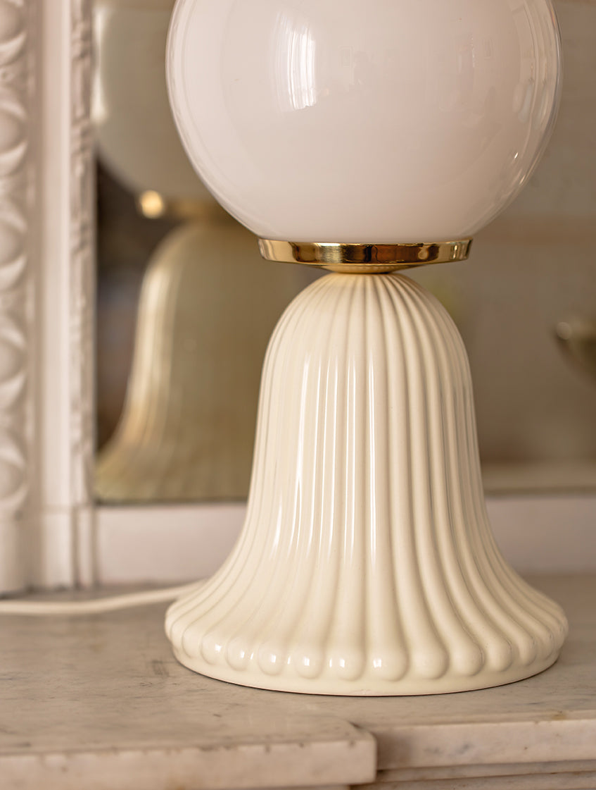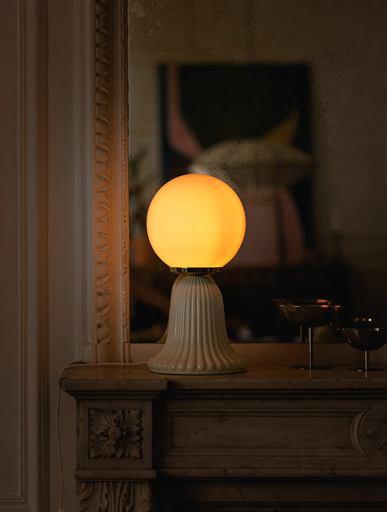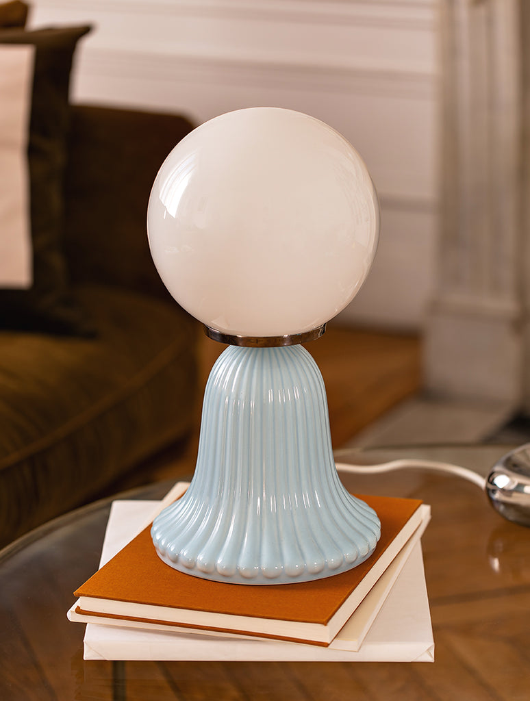 Une base en céramique, fabriquée à la main au Portugal, un globe opale blanc et ce petit éclat de métal qui change tout.