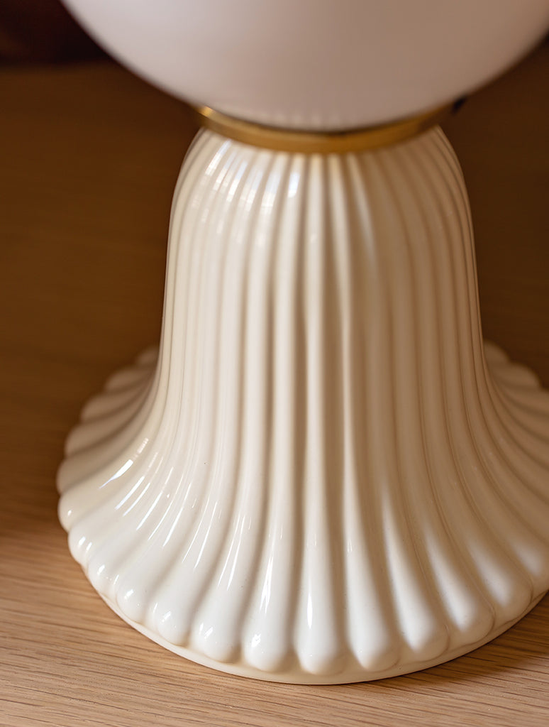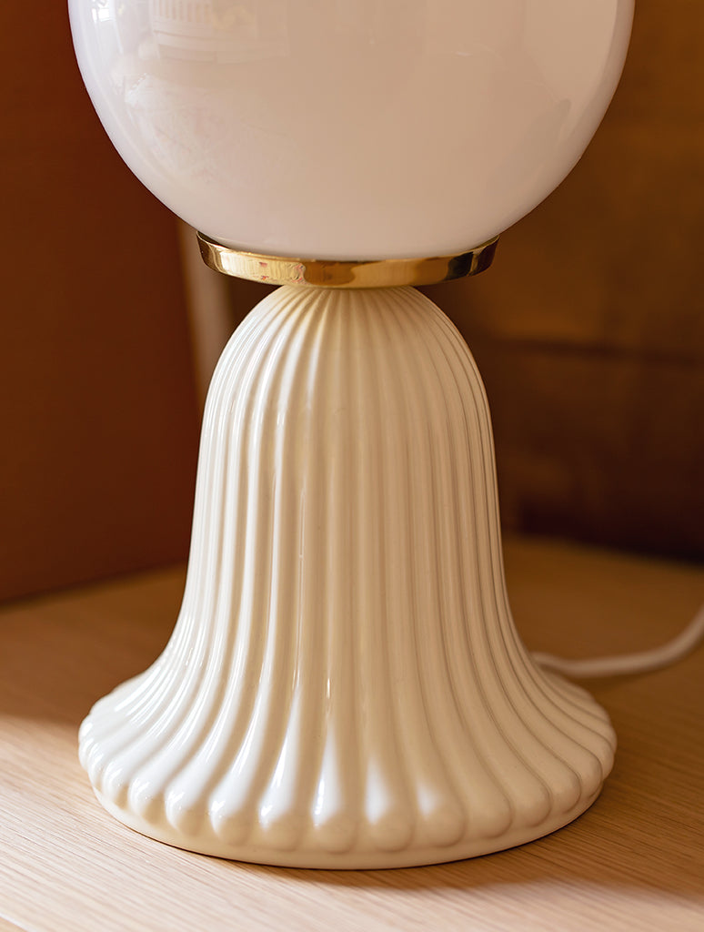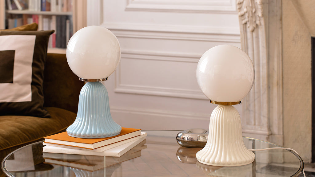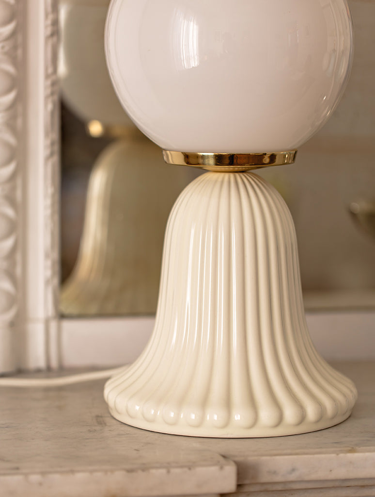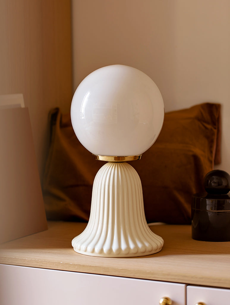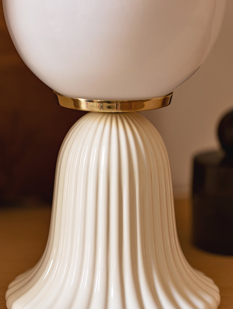 Une base en céramique, fabriquée à la main au Portugal, un globe opale blanc et ce petit éclat de métal qui change tout.