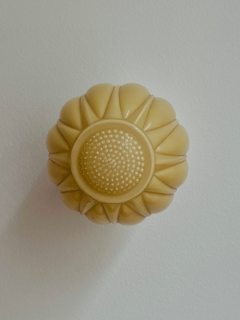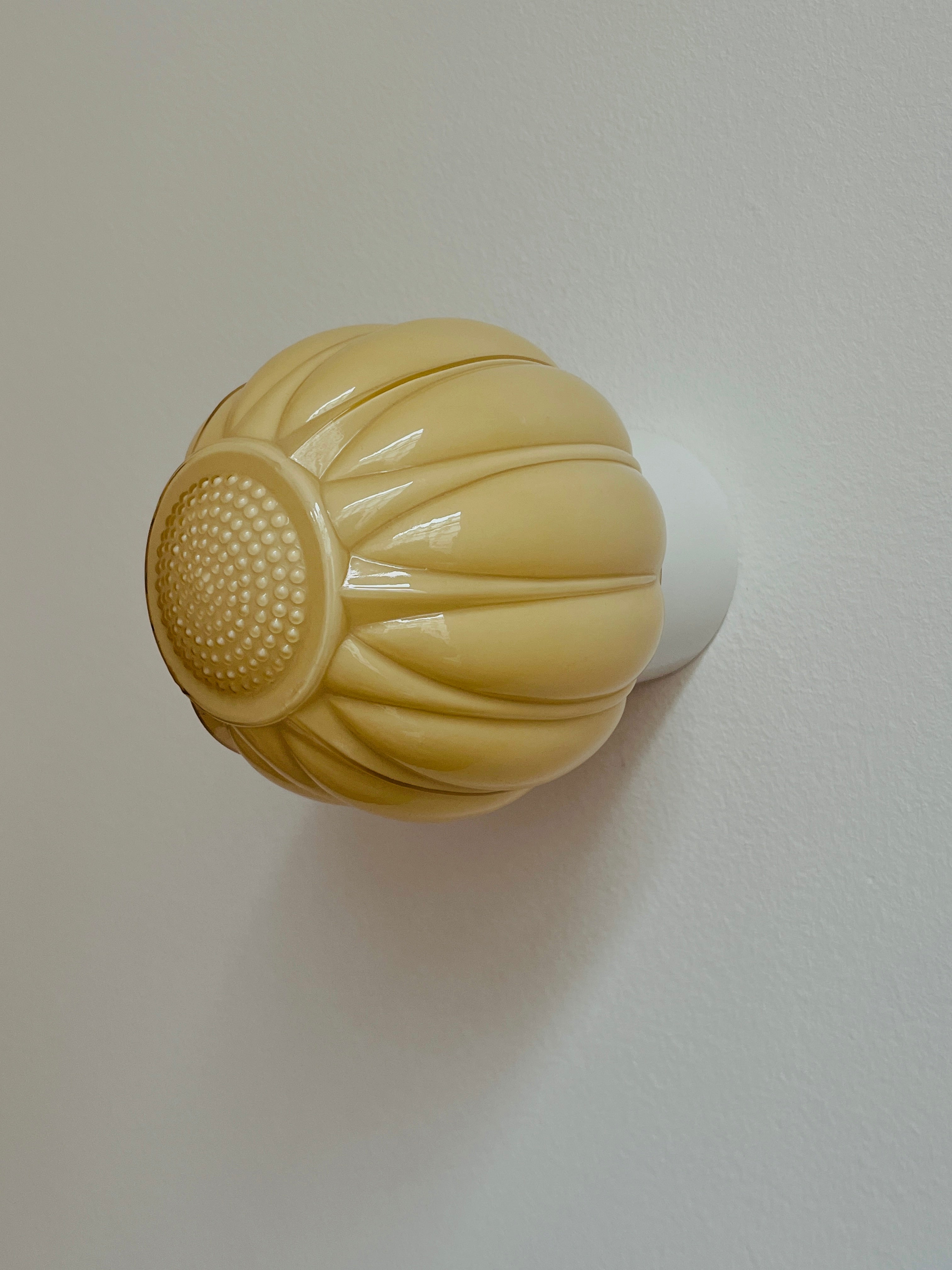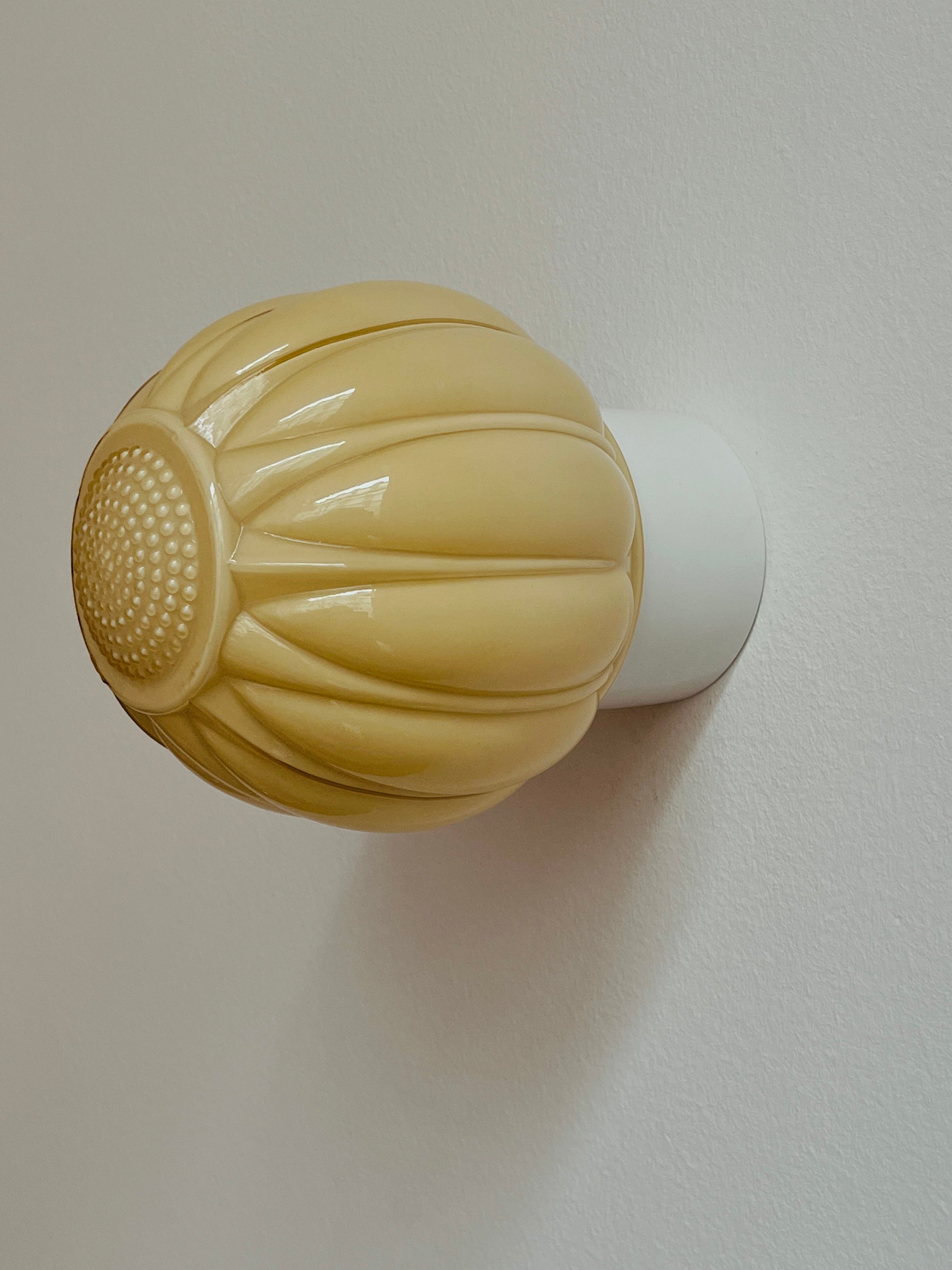 Applique murale vintage en opaline jaune, au globe délicatement strié et galbé. Montée sur une base en porcelaine blanche, elle diffuse une lumière douce et chaleureuse.