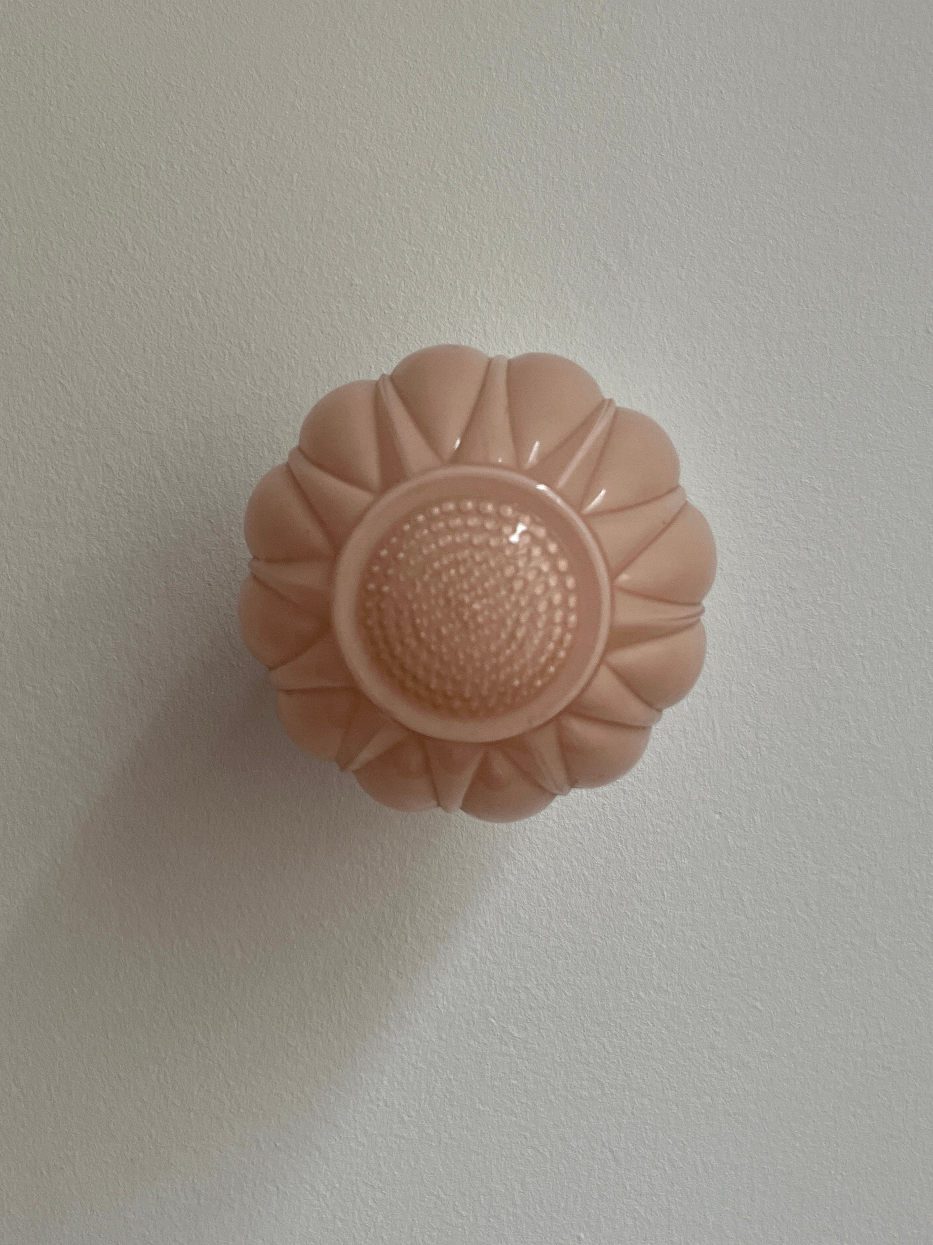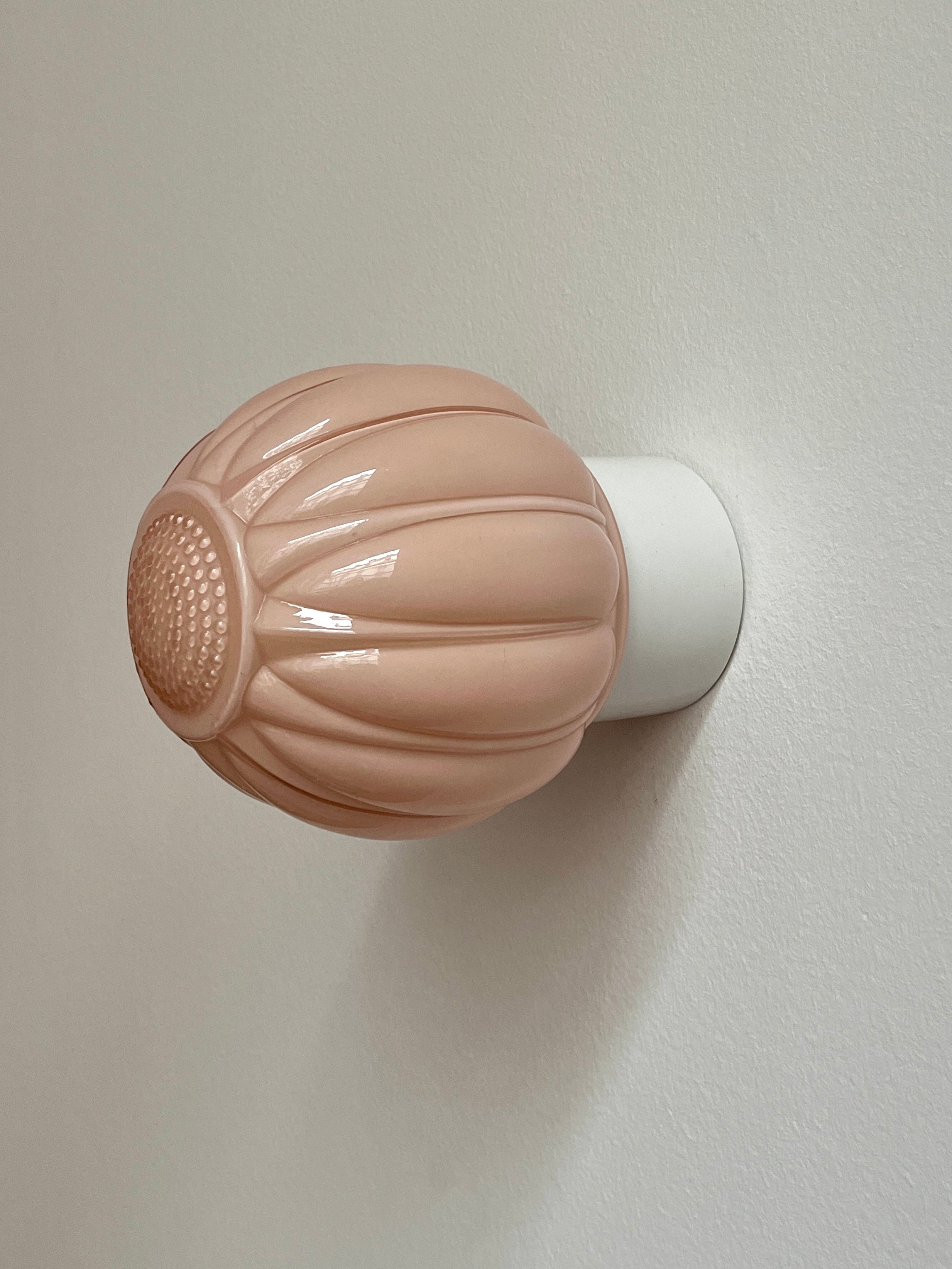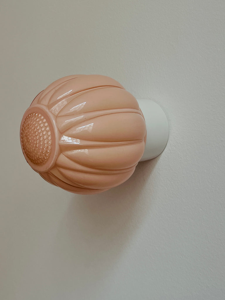 Daria, notre applique murale vintage en opaline rose, au globe délicatement strié et galbé. Montée sur une base en porcelaine blanche, elle diffuse une lumière douce et chaleureuse au charme résolument rétro.