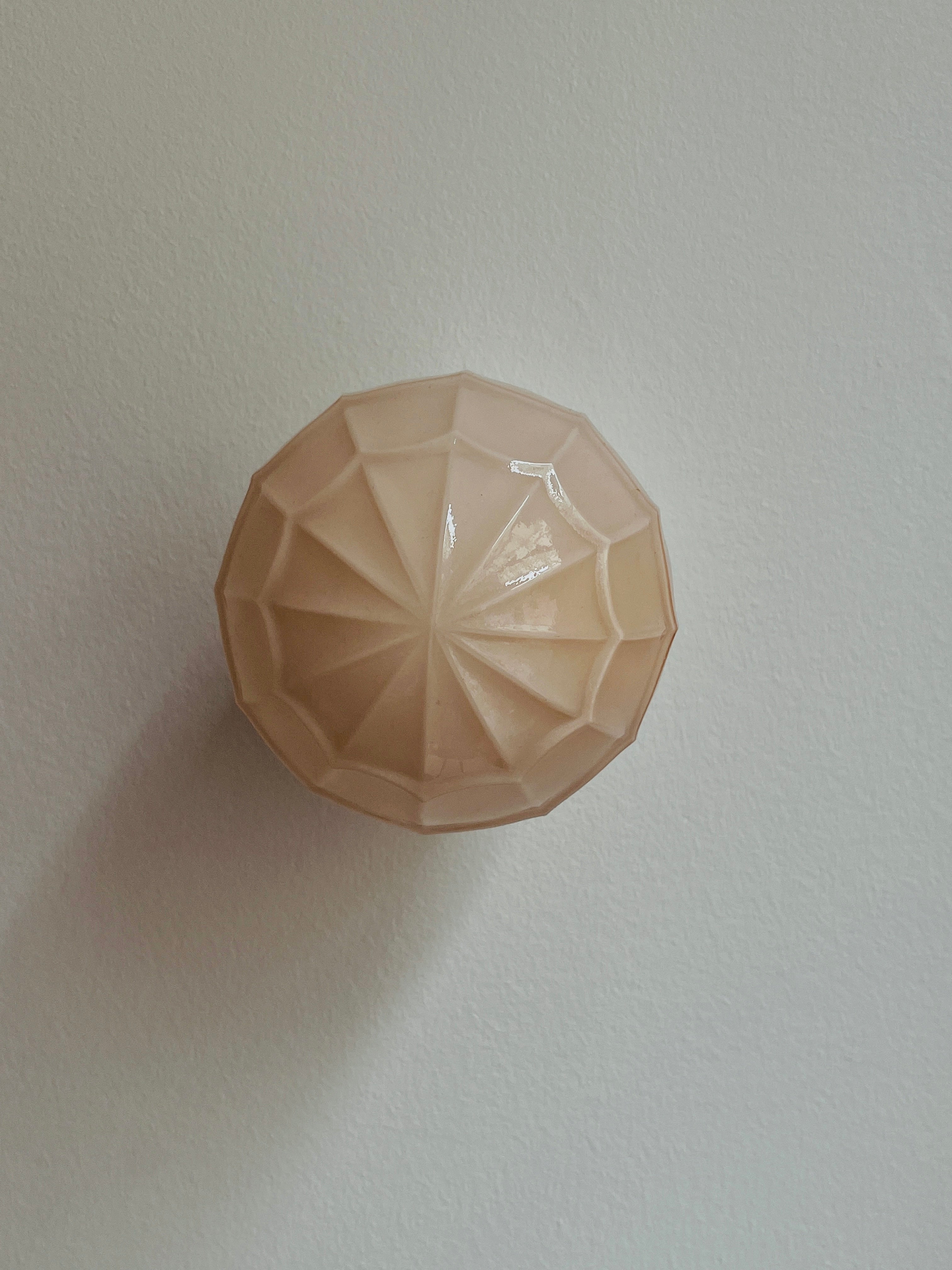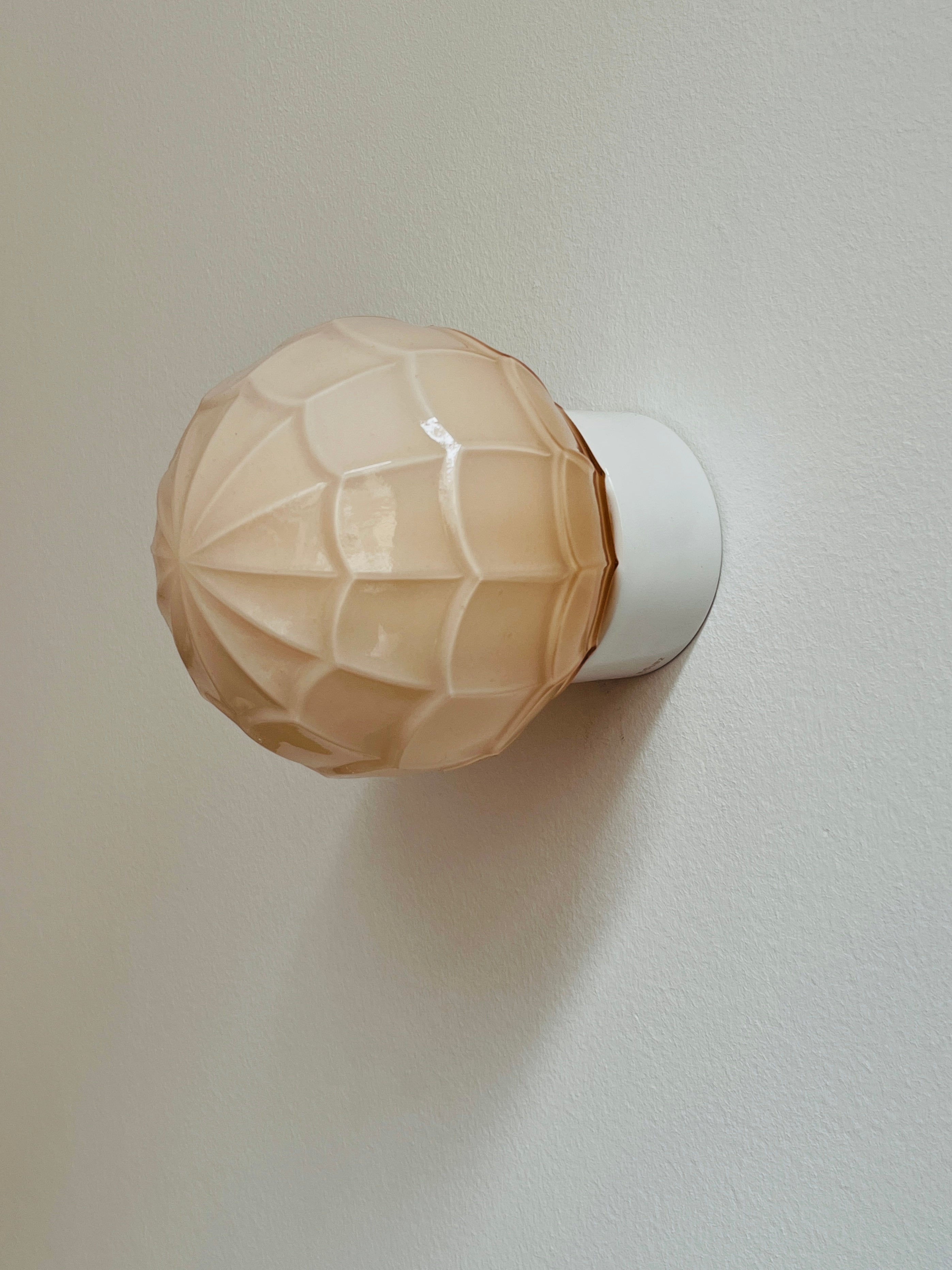 L'applique murale vintage Lotus en opaline rose diffuse une lumière douce et chaleureuse. Son globe à reliefs géométriques repose sur une base en porcelaine blanche, parfaite pour apporter du charme dans une chambre, un couloir ou une salle de bain.