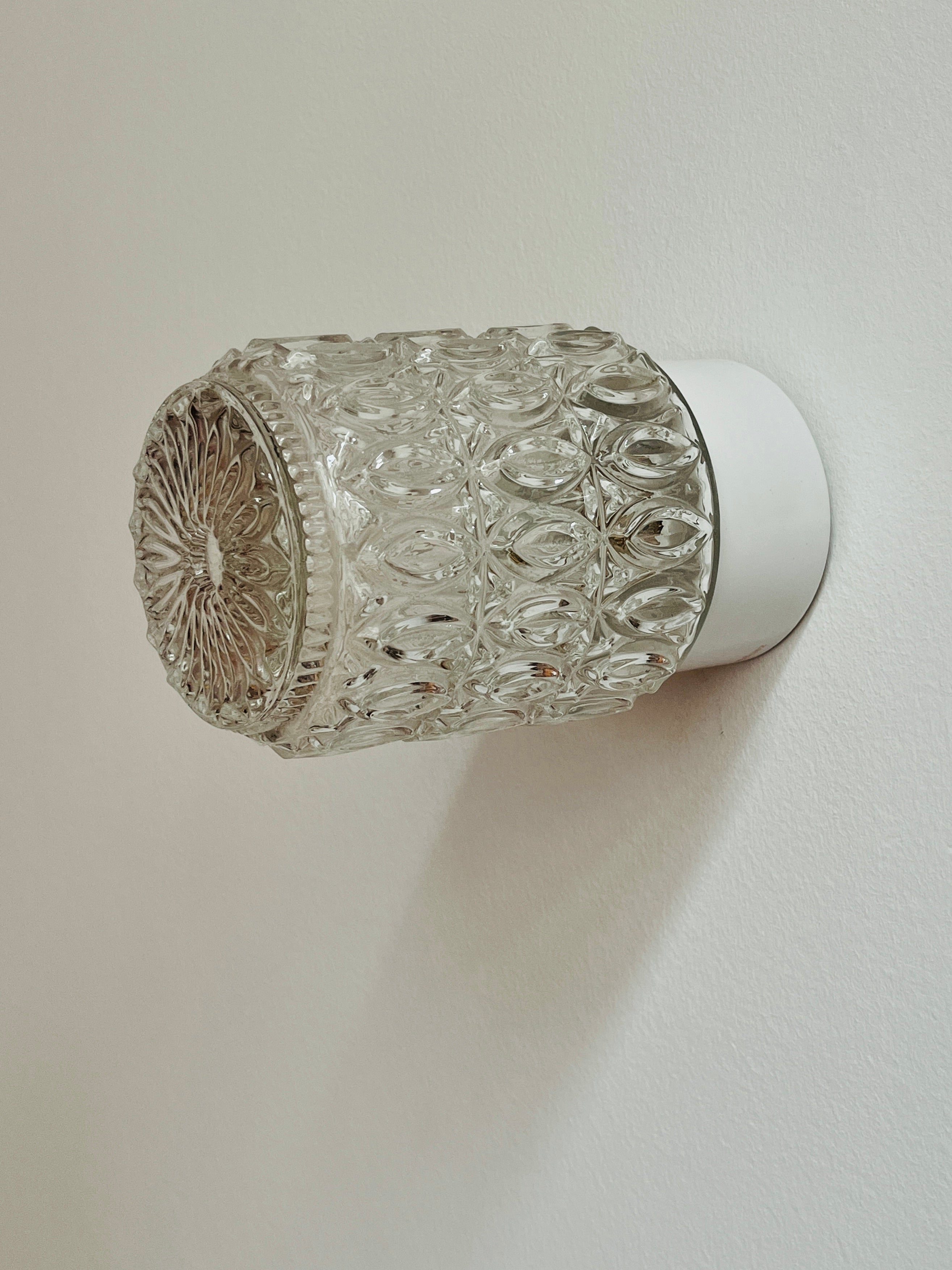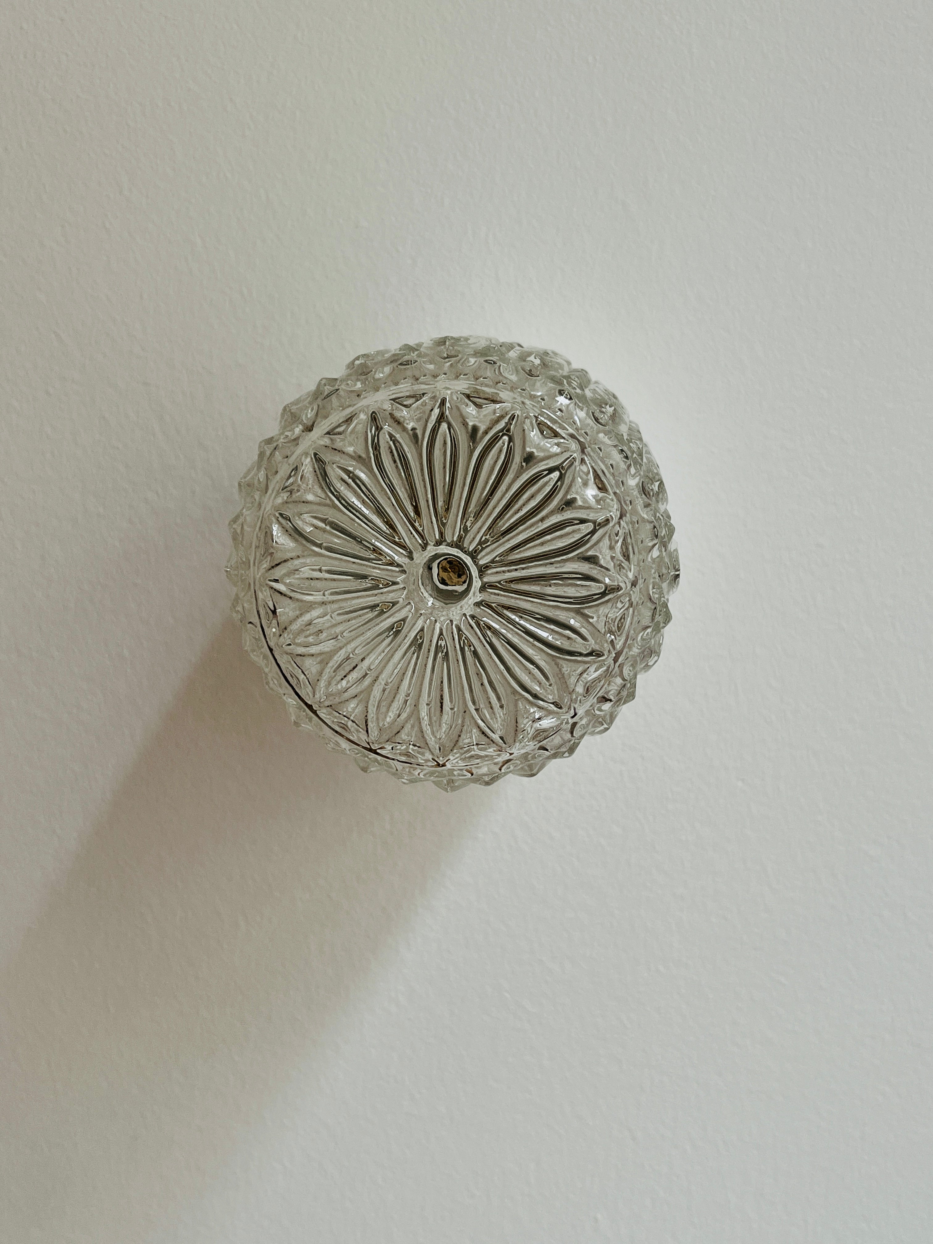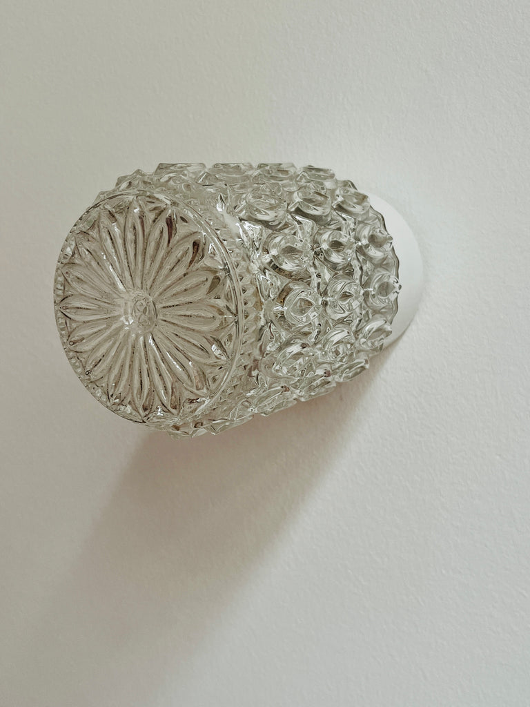Petra et son verre pressé vintage au motif floral et géométrique raffiné capte la lumière et crée de magnifiques reflets, apportant une touche élégante et intemporelle à tout intérieur.