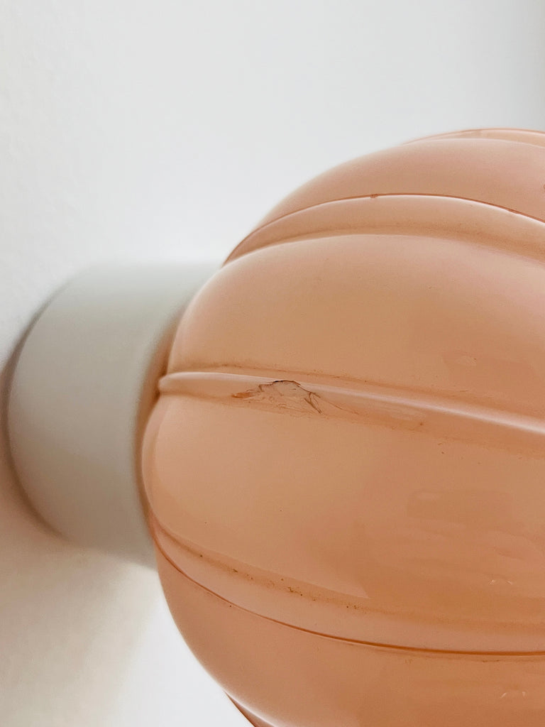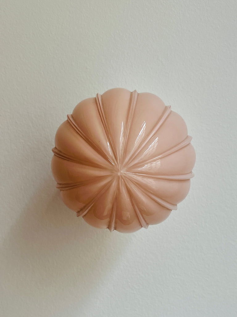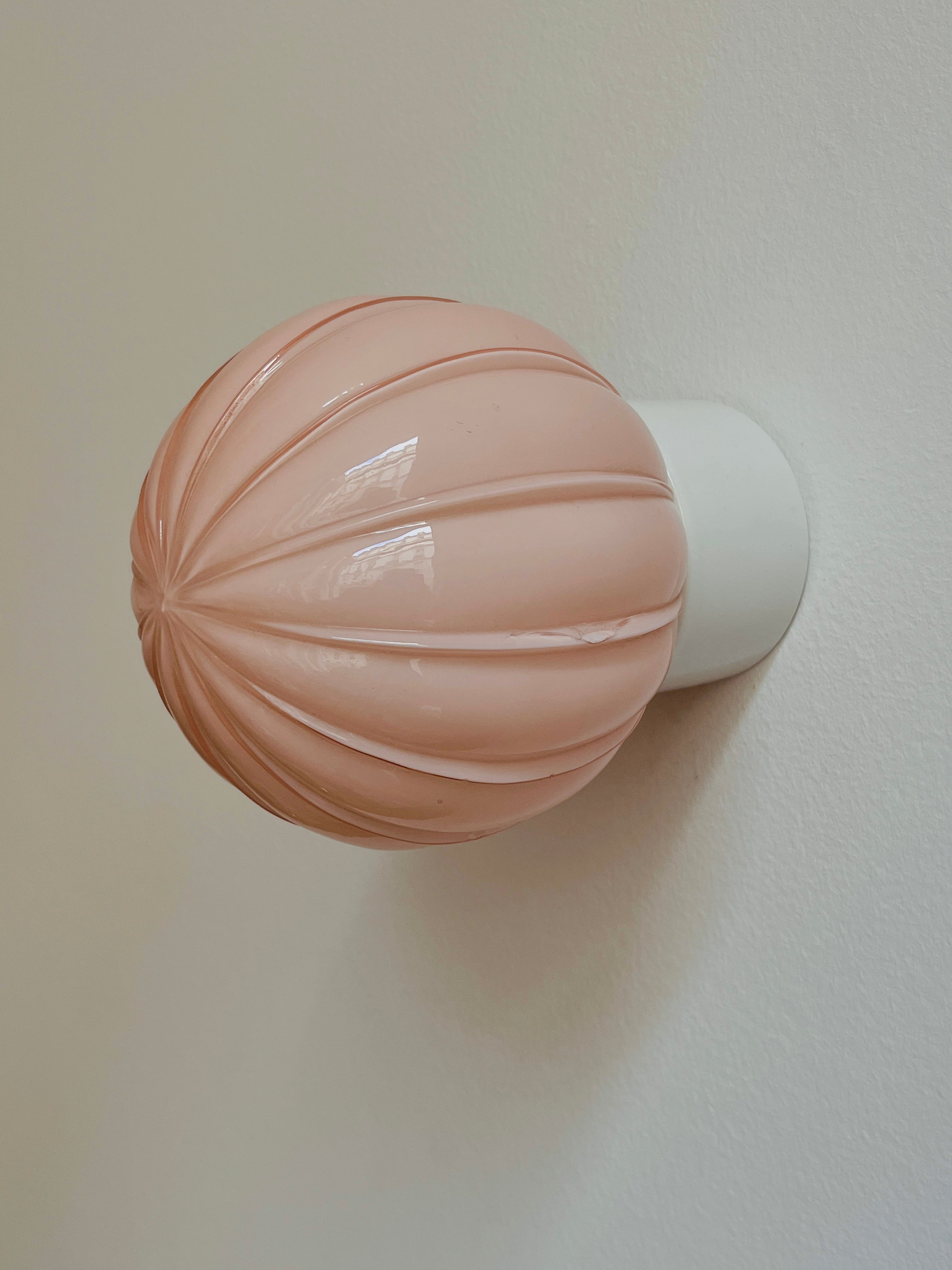 Notre applique vintage Pumpkin toute rond dans son opaline rose est parfaite pour réveiller une tête de lit, un miroir de salle de bain ou une chambre d'enfant.